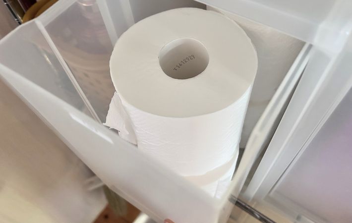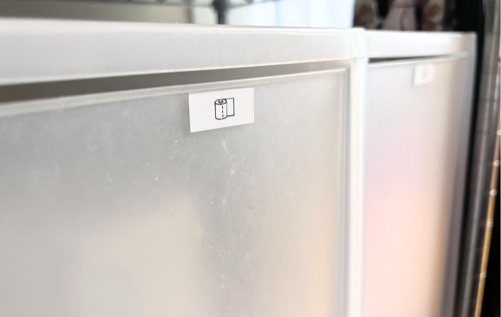 さらに、ストック収納に使っている無印の収納ケースには、『ティッシュ』、『トイレットペーパー』、『ドリンク』、『掃除用具』、『タオル』のアイコンを印刷し、ラベリングしました。