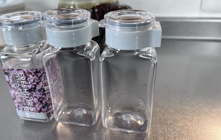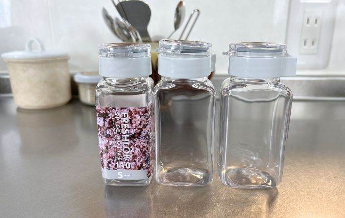 「憧れのすっきりキッチンに近づく!」 『フレッシュロックスパイスボトル』をレビュー ホーム・キッチン By - shio 更新:2026-03-04 ※本記事はUPDATEが独自に制作したコンテンツです。また、本記事を経由して商品の購入が発生した場合に、ECサイト等から送客手数料を受領することがあります。 キッチンで意外とごちゃつきやすいのが、スパイスや調味料の収納。 袋のままだと倒れたり、使うたびに出し入れが面倒だったりと、ちょっとしたストレスを感じることはありませんか。 毎日の料理をスムーズにするためには、『サッと取れて、サッと使える』収納がポイント! ということで購入したのが、タケヤ公式の『FRESHLOK(フレッシュロック) スパイスボトル』です。 Amazonで『タケヤ公式 スパイスボトル 保存容器 FRESHLOK グレー 1ホール 3個 5ホール 3個 計6個セット』を見る 楽天市場で『タケヤ公式 スパイスボトル 保存容器 FRESHLOK グレー 1ホール 3個 5ホール 3個 計6個セット』を見る 高気密性の密閉構造で中身を湿気から守りながら、冷蔵庫内や引き出しの中でも整理しやすい設計が魅力。 この記事では、『フレッシュロックスパイスボトル』の特徴や使い心地を詳しくレビューしていきます。 目次 1. 調味料管理がラクになるフレッシュロックのスパイスボトル2. 実際に詰め替えて使ってみた3. まとめ 調味料管理がラクになるフレッシュロックのスパイスボトル フレッシュロックシリーズから登場しているスパイスボトルは、スパイスや調味料を使いやすく管理できるように作られた保存容器です。 蓋はパッキンが付いた高気密構造になっており、湿気やニオイの侵入をしっかりガード。 塩や砂糖、だし粉、各種スパイスなどを入れても、固まりにくく、風味を保ちながら保存できます。 透明度が高いのでガラス製のように見えますが、実は丈夫で軽量なプラスチック製。 ガラスの保存容器のように、うっかり落として割れてしまう心配がないため、出し入れの多い場合も気を使う必要がありません。 今回、購入したのは容量は約110㎖と、普段使いのスパイスや調味料を入れるのにちょうどよいサイズ感。 内容量の目安は以下の画像を参考にしてください。 かさばりやすい袋ごとではなく、必要な分だけをコンパクトにまとめられるので、収納スペースを効率的に使えます。 『1ホール×3個』と『5ホール×3個』がセットになっていて、それぞれ用途に合わせて使い分けることができます。 1ホールタイプは、穴がやや大きめ。 粒が大きいスパイスや調味料、サラサラした粉末調味料を入れても詰まりにくく、調理中の動作もスムーズになります。 一方、5ホールタイプは、こしょうや七味、ドライハーブなど、振りかけて使うスパイスにぴったり。 穴が小さいため、一度に出る量をほどよく抑えながら、全体に均一に振りかけることができます。 実際に詰め替えて使ってみた 実際に調味料を詰め替えて使ってみました。 今回は、塩とシナモンシュガー、乾燥ひじきを入れて使用します。 まずは蓋を開け、パッキンと内蓋を外します。 最初、内蓋はやや外れにくいですが、凹み部分に指をかけて持ち上げると、スムーズに取り外すことができます。 専用じょうごがついてくるので、ぜひ活用しましょう。 専用なだけあって、スパイスボトルにぴったりハマるようになっており、粉末でもこぼしにくく、スムーズに詰め替えることができます。 中身を入れたら、内蓋をセットします。 この時、本体と内蓋の凹凸の向きを合わせてから押し込みましょう。 位置が合っていると、蓋がしっかり正しい位置にはまります。 詰め替えたボトルを引き出しに収納すると見た目に統一感が出て、すっきり整った印象に。 筆者 中身が一目でわかるようラベルを貼ると、さらに使いやすくなりました。 サイズがコンパクトなので、ほかの調味料と並べて入れても場所を取りにくいです。 高さもほどよく、引き出しを開けた時に中身が一目でわかるのも便利なポイント。 必要な調味料をすぐに取り出せて、調理中の動作もスムーズになりました。 出方はというと、どの調味料も問題なく出てきます。 途中で穴が詰まることもなく、軽く振るだけで必要な量を出せるのはポイント高いです。 筆者 サラサラタイプのお塩や粉末調味料は、大きい穴の1ホールタイプに入れた場合は出しすぎには注意かも。 5ホールタイプは全体に均一に振りかけることができるので、味つけの加減をしながら使いたい時に便利。 蓋は開けた状態をキープできる仕様になっていて、片手でサッと開けて、そのままの状態で使えるので、忙しい調理中でも扱いやすかったですよ。 筆者 おにぎり作りによかった! 蓋を閉めるとパチッと心地よい手応えがあり、しっかり密閉されている感覚があります。 湿気が気になる場所やシーズンも保存状態を気にせず管理できるのは嬉しいですね。 お手入れのしやすさもGOOD。シンプルな構造なので、分解して洗うのが簡単でした。 ただし