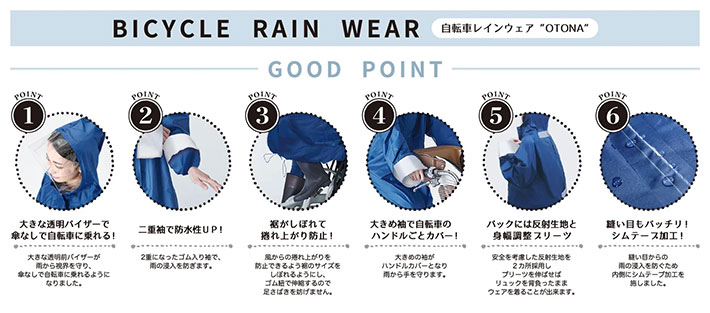 『HARAINY 自転車レインウェア』シリーズは、雨の日の自転車走行をより安全にし、快適に過ごせるように次のような6つの基本機能を備えています。