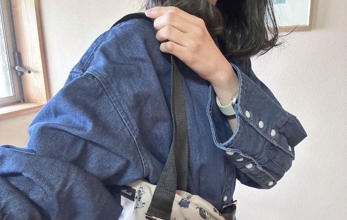 バッグの持ち手は肩掛けができるほどの長さがあり、荷物が多い日でも両手が空いて持ち運びしやすいように作られています。
