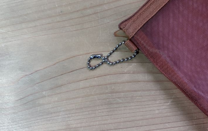 ポーチにはキーボールがついていて、バッグの持ち手や金具部分に取りつけることができます。