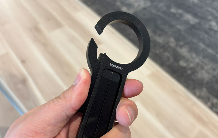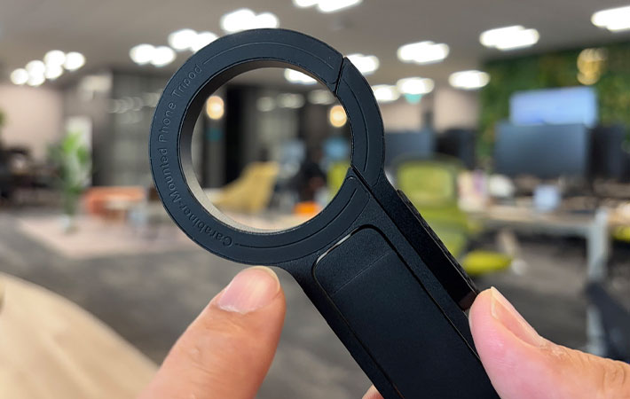 iPhoneを取りつけるリング部分はスライド式のカラビナになっているので、バッグの取っ手部分に引っかけて持ち運ぶことができますよ。