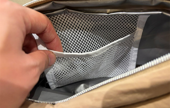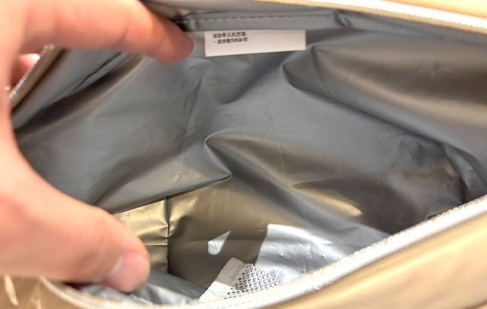 ちなみに、内ポケットはメッシュ素材になっているので、ここに保冷剤を入れておくと保冷力がより高まりそうです。