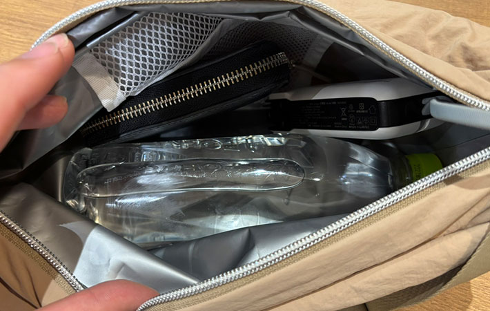 バッグの外観はコンパクトですが、メインポケットには横にした500mLペットボトル容器が3本入り、見た目以上の収納力となっています。