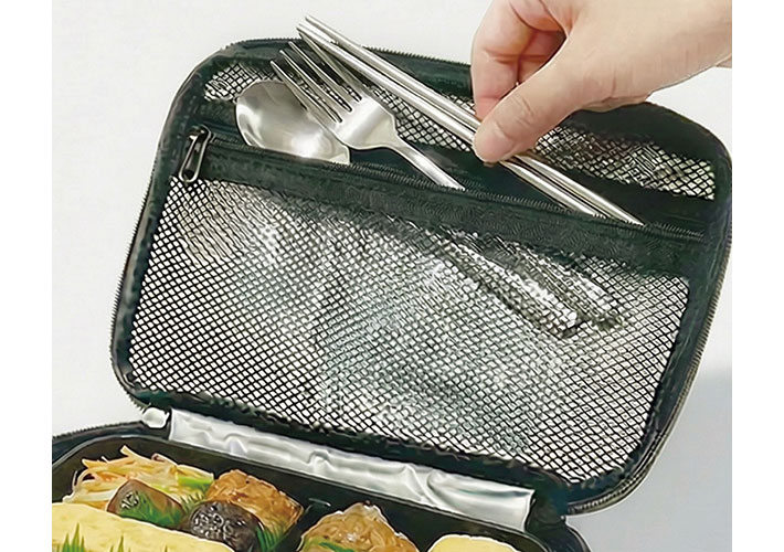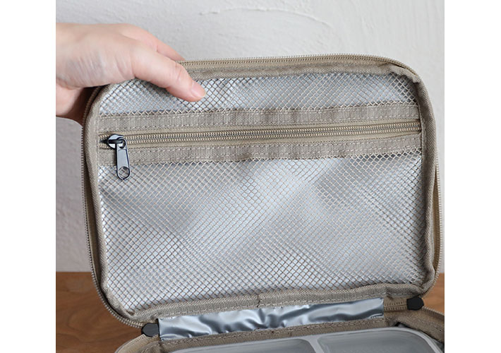 フタの内側にはメッシュポケットが配置されているため、カトラリーなどの収納に役立ちます。保冷剤を入れてもよさそうですね。