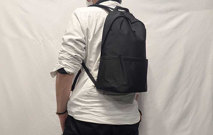ライトシェルリュックを身長178cmの筆者が背負ってみた状態がこちら。