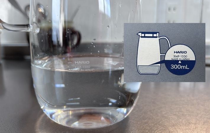 300㎖の目安はロゴの下あたり。目盛りがないのが少々不便ですが、ロゴの位置さえ覚えれば問題ありません。