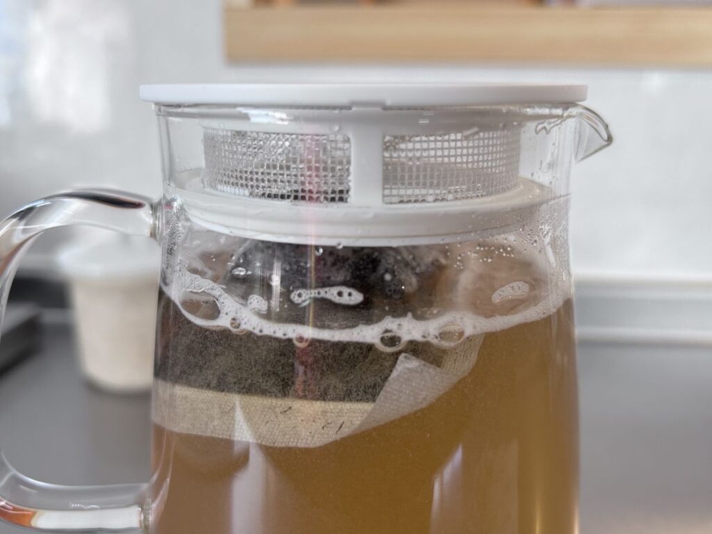 蓋にはぐるっとメッシュがついていて、茶葉やティーバッグをしっかり受け止めてくれるため、そのまま注げて便利です。