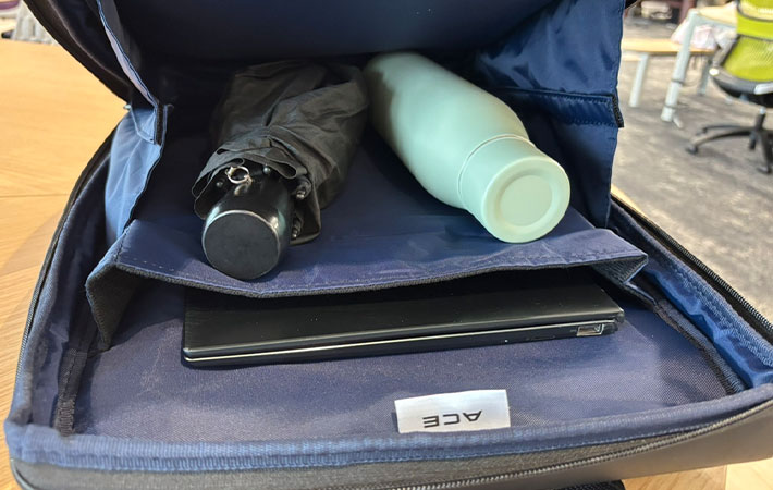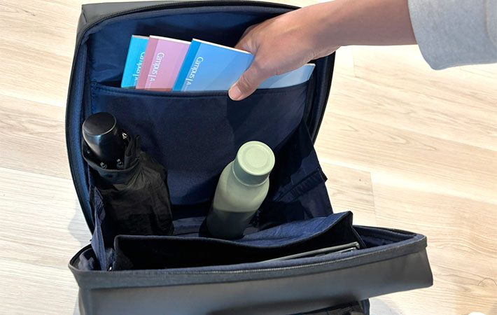 ノートパソコンのほかに、折りたたみ傘や大きめの水筒を入れても、まだまだスペースには余裕あり。