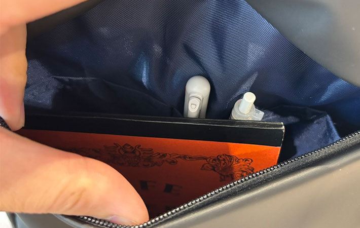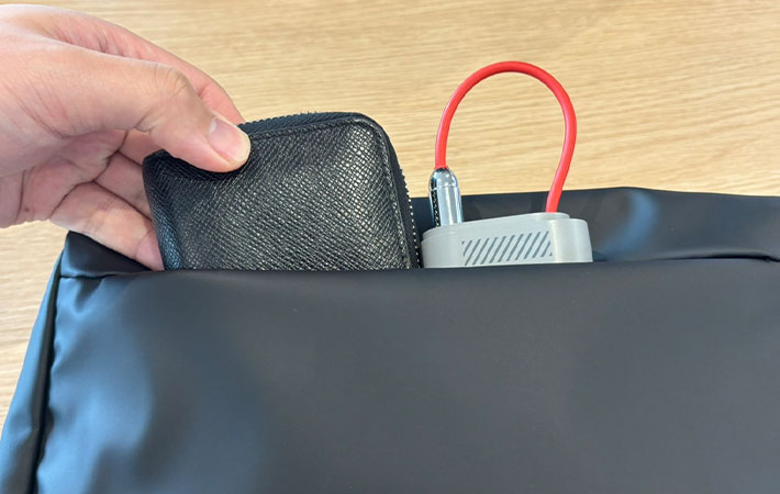 上のコンパートメントはサイズが小さめですが、コインケースやモバイルバッテリーなどが入ります。よく取り出すものはこちらに入れるといいでしょう。