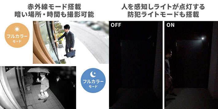 暗い場所では赤外線によるモノクロ撮影で周囲をしっかりカバーし、必要に応じて白色LEDによるカラー夜間撮影にも対応。夜間でも対象を鮮明に記録できるため、防犯性を高めることができます。