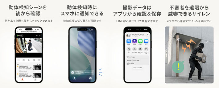 そのほか、専用アプリを使えば、外出先からでもリアルタイムの映像確認や録画データの再生が可能。異変をすぐに把握できます。