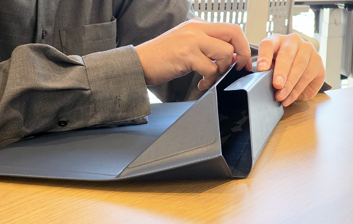 ケース本体にはあらかじめ折り目が入っており、そのガイドに沿って折りたたむことでスタンドへと変形します。