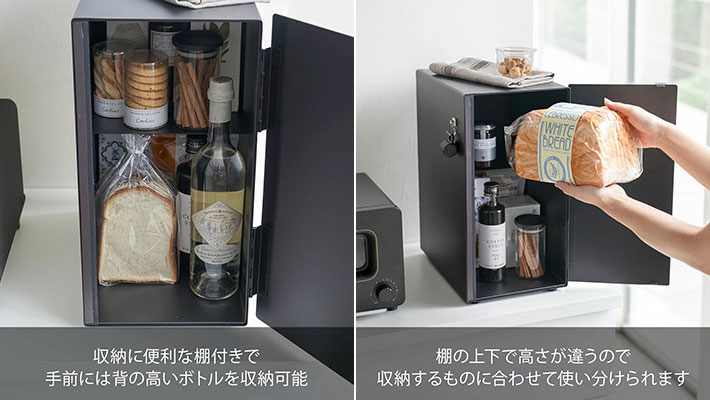その名の通りパンを入れられるのはもちろん、キッチン用品や調味料、お菓子、ワインなどをまとめてすっきり収納できるブレッドケースです。
