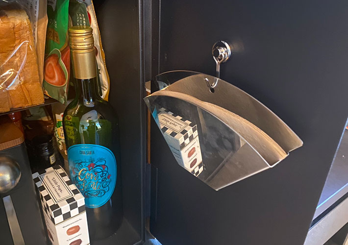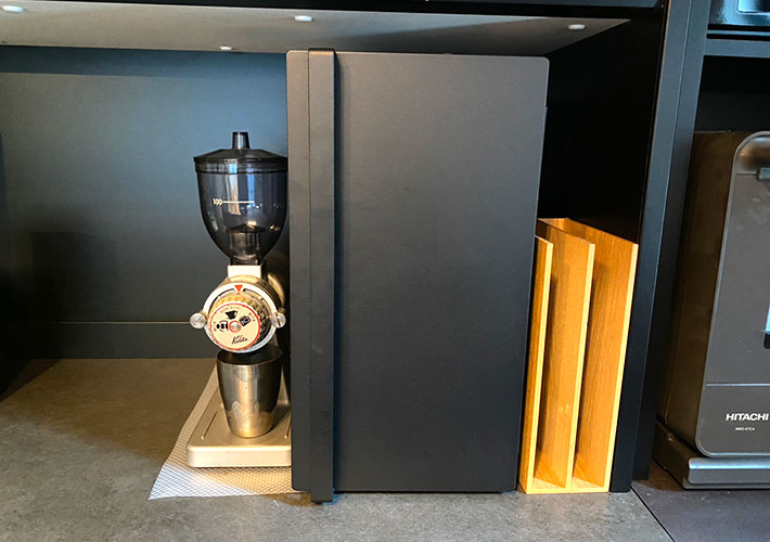 筆者は扉の内側にマグネットフックを取りつけ、コーヒーフィルターケースを収納。コーヒー豆と一緒にすぐフィルターを取り出せるようにしています。