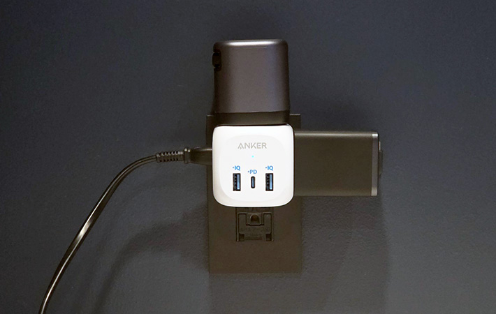 ノートPCのACアダプタのほか、スマホやイヤホン用の充電ケーブルをまとめて接続できるので、ホテルのコンセント不足に困る場面でも頼りになる存在です。