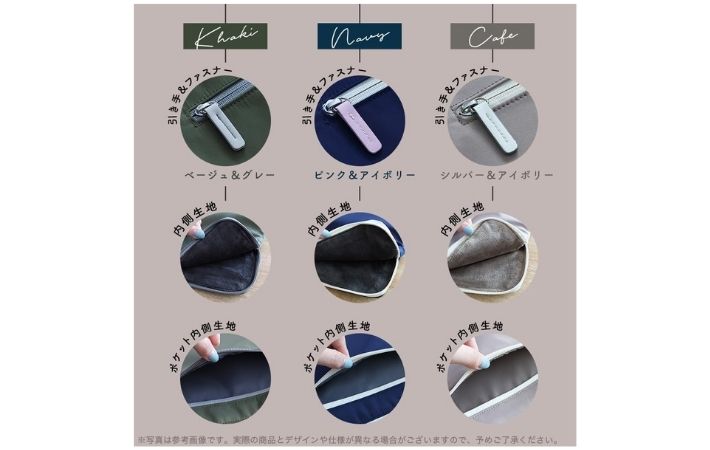 ファスナー部分はアイボリーになっており、本体カラーとのコントラストがおしゃれ。
