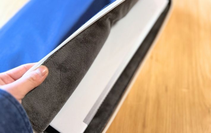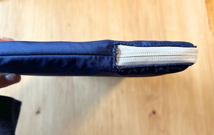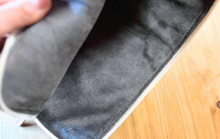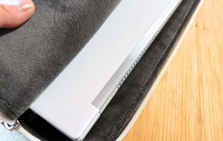 内側もポリエステルですが、クッション材と裏起毛を採用することで機器を傷つけず、包み込む生地感になっています。