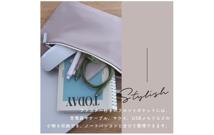 裏起毛素材が使われていて、パソコンをしっかり保護できる安心感がありながら、フロントポケットつきで小物もまとめて収納できる実用的なつくり。
