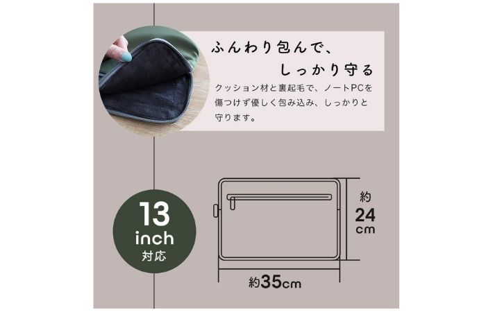これなら高いケースはいらないかも お手頃価格のPCケースがデザインも使い勝手も抜群だった 新着 By - shio 更新:2026-03-22 ※本記事はUPDATEが独自に制作したコンテンツです。また、本記事を経由して商品の購入が発生した場合に、ECサイト等から送客手数料を受領することがあります。 通勤や通学でノートパソコンを持ち歩く時、PCケースを活用している人は多いでしょう。 バッグにそのまま入れてしまうと、衝撃や擦れで傷がつく可能性があり、故障の原因にもつながりかねません。 ただ、PCケースといっても種類が多く、「できればお手頃価格で、デザイン的にも機能的にも安心して使えるものがいい」と思う人は少なくないでしょう。 そこでぜひチェックしてほしいのが、『MOTTERU(モッテル)』の『sofumo ノートPCケース』です。 Amazonで見る 楽天市場で見る 『MOTTERU』は神奈川県で生まれたデジタルアクセサリーブランド。使いやすさだけでなく、毎日持ち歩きたくなるようなデザイン性にこだわった製品を展開しています。 ご紹介する『sofumo ノートPCケース』は、13〜14インチのノートパソコンに対応した PCケース。 ぱっと見シンプルながらおしゃれなデザインなので、ルックスにもこだわりたい人におすすめです。 『sofumo ノートPCケース』のデザインや機能性について、実際の使い心地を交えながらレビューしていきます。 目次 1. 毎日使いたくなるおしゃれで機能的なPCケース1.1. まずはデザインと素材をチェック1.2. 便利なフロントポケット2. 実際にPCを入れてみた3. まとめ 毎日使いたくなるおしゃれで機能的なPCケース サイズ(約):縦24cm×横35cm×厚さ11.6cm 対応機種:13.0インチ、13.3インチ、14.0インチ 重量(約):150g まずはデザインと素材をチェック 『sofumo ノートPCケース』は、シンプルながらもさりげなくおしゃれなデザインが印象的。 メインカラーは落ち着いたネイビーで、通勤や通学などさまざまなシーンになじみやすい色合いです。 ファスナー部分はアイボリーになっており、本体カラーとのコントラストがおしゃれ。 ファスナートップは淡いピンクで、大人でも使いやすいかわいらしさも感じられます。 ほかにも、カーキとカフェというブラウン系のカラーもありました。 Amazonで別のカラーを見る 楽天市場で別のカラーを見る 全体はシンプルですが、細かな配色に遊び心があるのがいいですね。 表素材は汚れや水濡れに強そうな質感のポリエステル。 内側もポリエステルですが、クッション材と裏起毛を採用することで機器を傷つけず、包み込む生地感になっています。 全体的にスッキリとしたかさばらないサイズなので、バッグやリュックの中に入れて使うのもおすすめです。 便利なフロントポケット ケースの前面にはファスナーつきのポケットがデザインされています。 ここには充電器やケーブル、マウス、USBメモリなどのアクセサリをまとめて収納できます。 ノートパソコンとは別に収納できるため、必要な時にサッと取り出しやすいのはかなり便利なポイントでしょう。 また、小物を分けて持ち運べることで、パソコン本体とぶつかって傷がつく心配も軽減できます。 実際にPCを入れてみた さっそく、筆者の持っている13インチの『dynabook』を入れてみました。 サイズはほどよくフィットする印象。きつすぎずゆるすぎないちょうどいい収まり方です。 ファスナーの引き手が大きめにデザインされているおかげで開閉はとってもスムーズ。パソコンの出し入れもしやすかったです。 ただし、ケース自体がスリムな設計のため、厚みのあるマウスや大型のバッテリーなどを入れると、表面が少しボコッとしてしまう点は気になりました。 見た目のスマートさを優先するなら、なるべく薄型のアクセサリを選んで収納するほうがおすすめです。 内側は裏起毛素材になっていてふんわり包み込んでくれている感じ。 長期の旅行や出張などで少々タフに扱っても安心できる素材感です。 また、ケース自体が比較的スリムなのも気に入ったポイントです。 バッグやキャリーケースに入れてもかさばりにくく、日常的にパソコンを持ち歩くシーンにピッタリです。 また、見た目のデザインがよいのも魅力の1つ。 PCケースというと、どうしてもかたいデザインが多い印象ですが、このケースはやわらかい雰囲気があります。 特に気に入っているのはピンクのファスナートップとネイビーのコントラスト。 クールさの中にほんのりキュートさも感じられる色使いで、シンプルだけどさりげないアクセントになっています。 機能性だけでなく、見た目にもこだわりたい人にとっては、惹かれるポイントの多いPCケースだと思いますよ。 まとめ 『MOTTERU』の『sofumo ノートPCケース』をご紹介しました。 裏起毛素材が使われていて、パソコンをしっかり保護できる安心感がありながら、フロントポケットつきで小物もまとめて収納できる実用的なつくり。 さらに、ネイビーとアイボリー、ピンクの配色の組み合わせがケース自