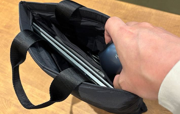メモパッドやUSBメモリーなどを入れてもまだ余裕があるので、内ポケットに財布や鍵を入れれば『Puffy Laptop Sleeve』1つでテレワークに出かけられるでしょう。
