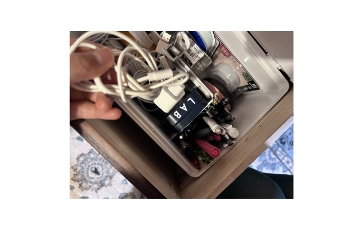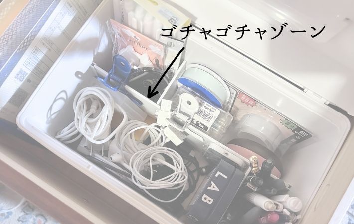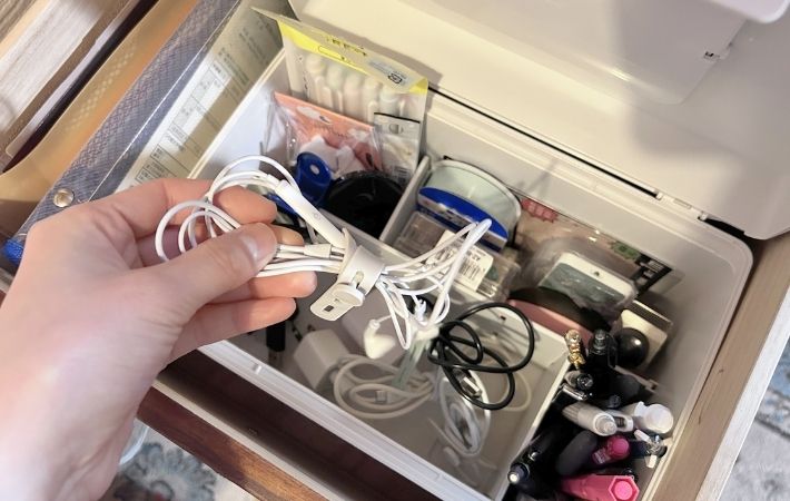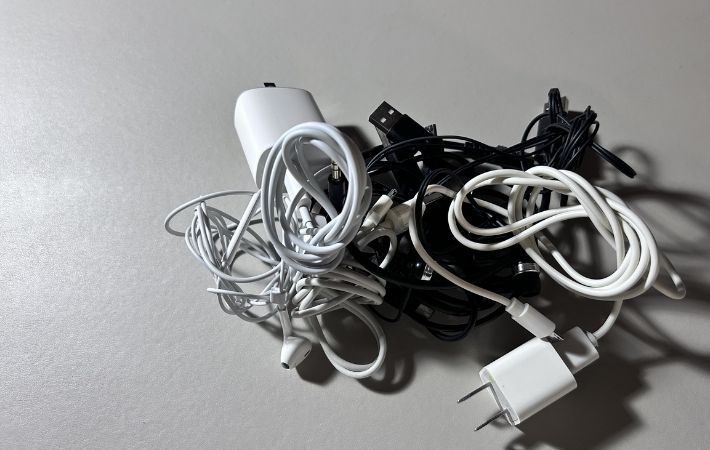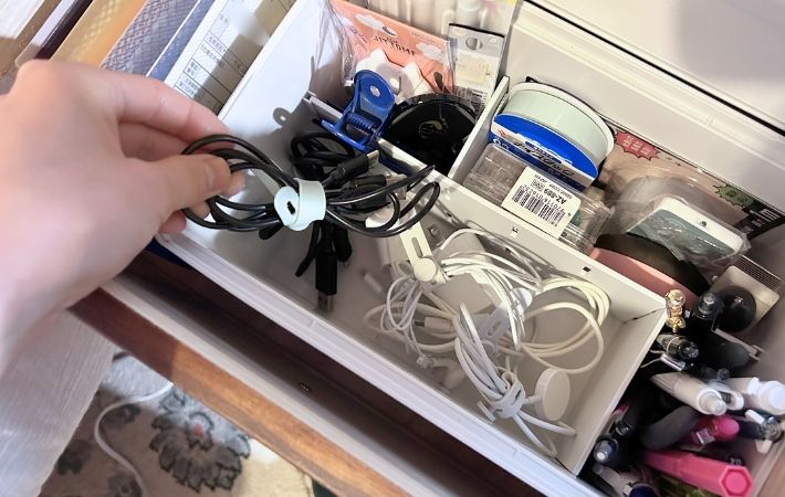 筆者はこれまで、棚の引き出しの中に『いろいろな種類の充電ケーブル』をまとめてしまっていたのですが、どうしてもコードが絡まり、ごちゃついてしまうのが長年の悩みでした。