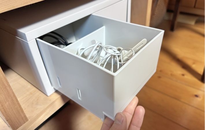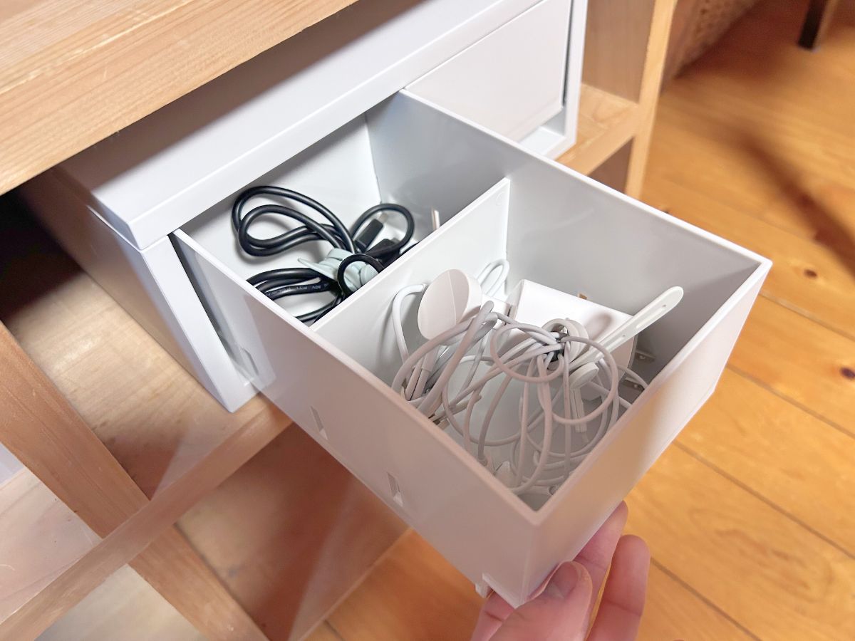 まとめたケーブルを収納するのは、無印良品の『小物収納ケース 中 引出2個』。