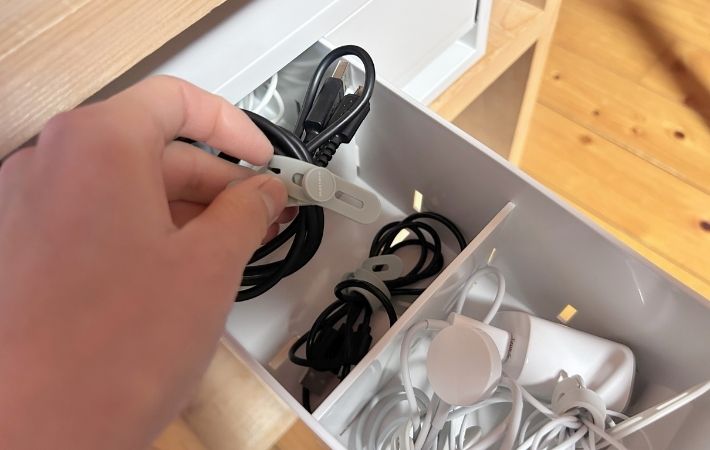 特に悩ましいのが、スマートフォンやパソコン、ドライヤーといった家電の『コードやケーブル類』。気づくと絡まっていたり、引き出しの中に適当に詰め込んでごちゃごちゃになったりしがちです。