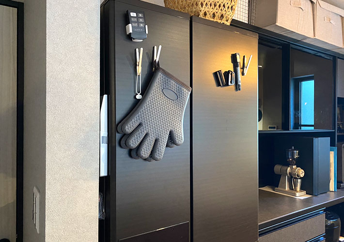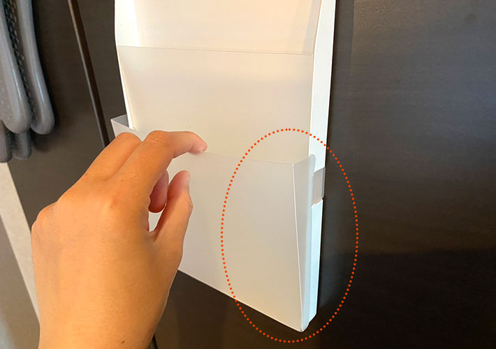 こういった冷蔵庫の隙間に貼りつけておけるので、すぐに手に届くと同時に、表には出して置きたくないものを収納するのにぴったりです。