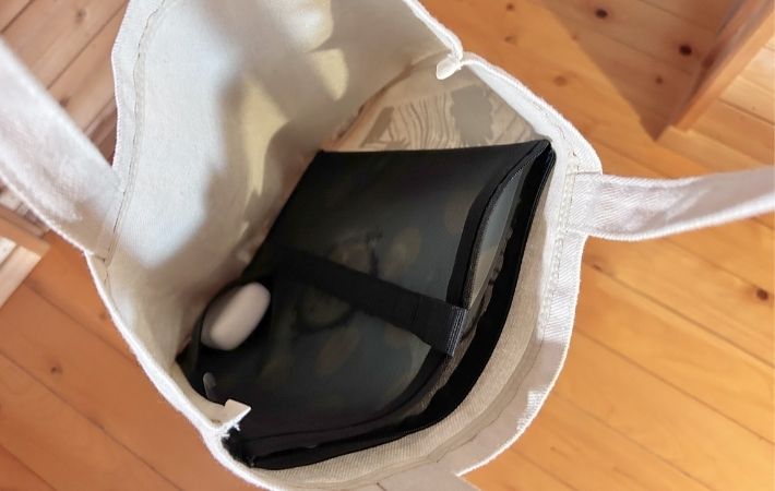 マチがないトートバッグの中で仕切り板のような役割を果たしてくれるので、バッグのシルエットをきれいに保ってくれますよ。