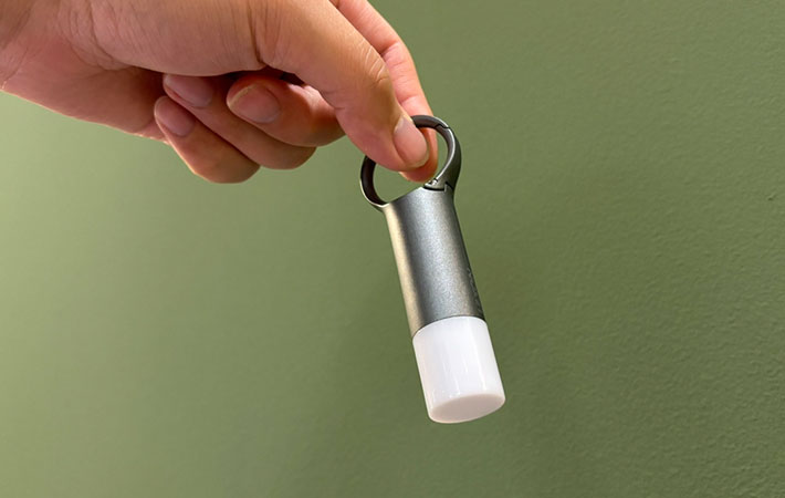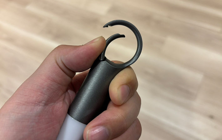 カラビナの根元付近についているボタンを押して操作しますが、ボタンが小さいので、まずは明るいところで試してから使うとよいかもしれません。