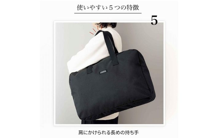 また、持ち手が長めに設計されているため、厚手のジャケットやスプリングコートの上からでも、ストレスなく肩掛けが可能。