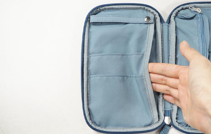 右側には2~3本のペンを入れるのにちょうどいいファスナー収納に加え、2サイズのポケットが。