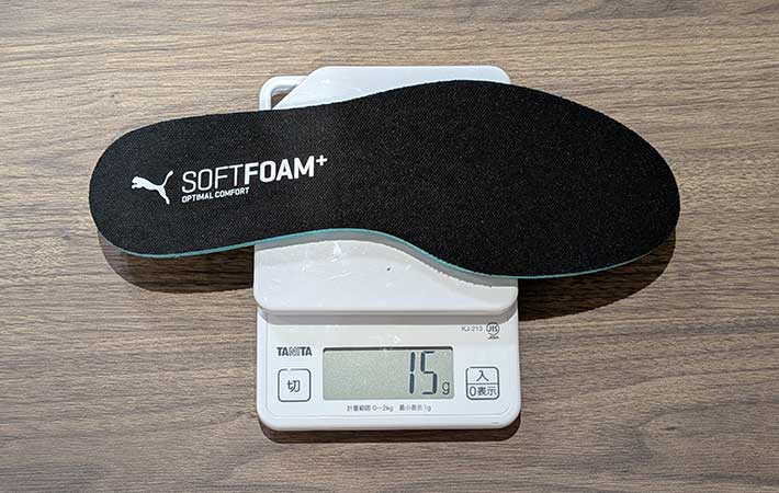 筆者の足のサイズに合わせたインソールは30gくらいが平均なので、約半分と言えます。