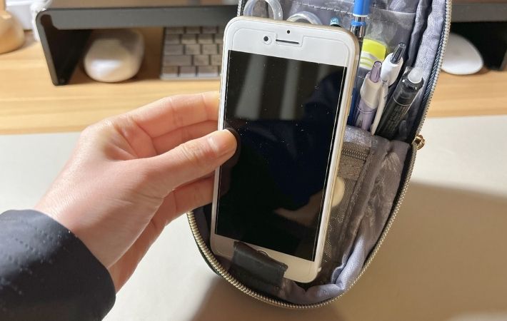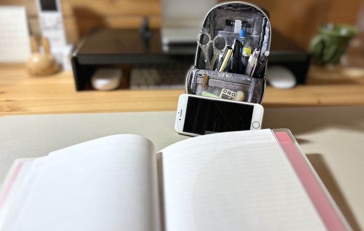 スマホとペンポーチの居場所がギュッと集約されるので、デスクの上が広々と使えるようになりました。