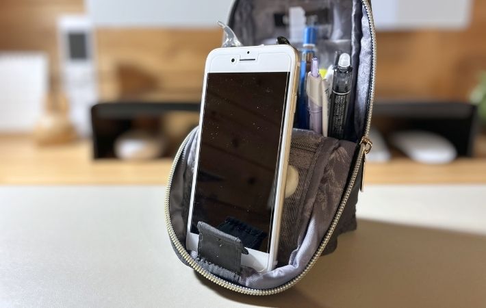 ポーチが空の状態だと、スマホの重さで少し不安定になることがあります。
