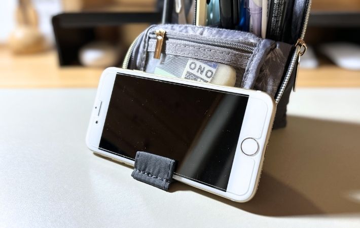 このポーチの最大の特徴は、スマホスタンドとしても使えること!