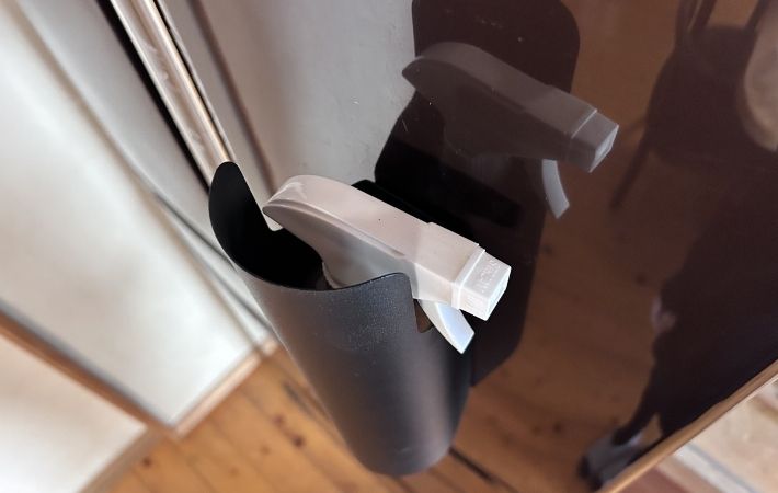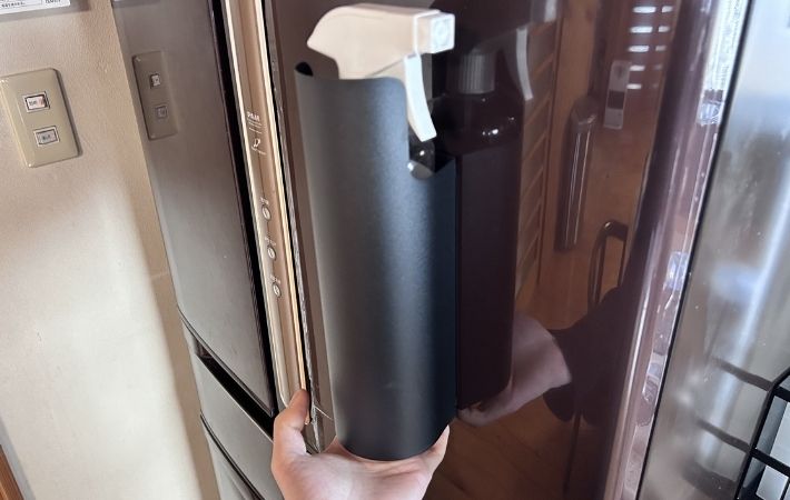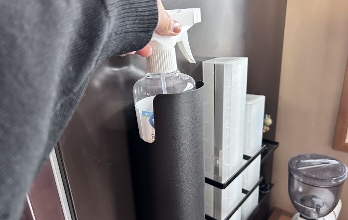 洗濯機や冷蔵庫の側面にピタッと貼りつけるだけで、スプレーボトルの定位置を作り出すことができます。
