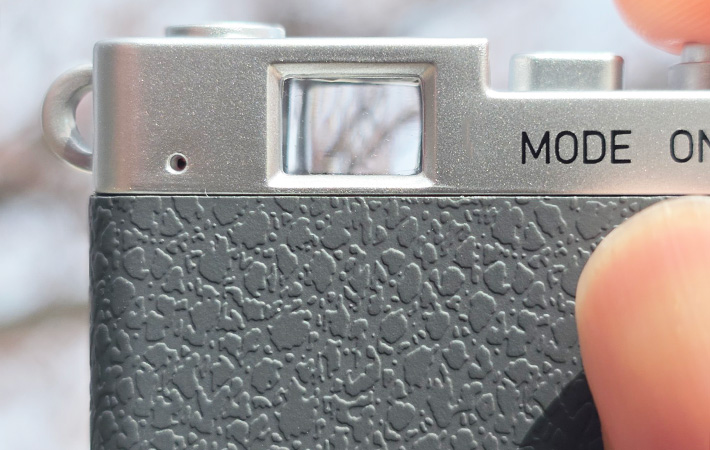 ファインダー風のパーツがついていますが、正面がぼんやり見える程度なので、あくまでデザインの一部。