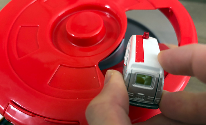 蓋の小窓から『トミカ』を1台ずつ入れていけば、坂道状でぐるぐると回りながら『トミカ』を収納できる仕組みです!