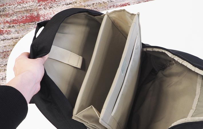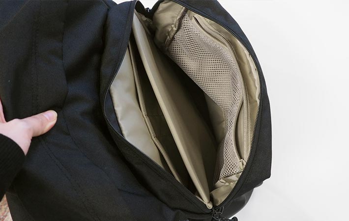 開いてみると、パッド入りスリーブやメッシュポケットなどがあり、荷物が迷子になりにくい設計です。