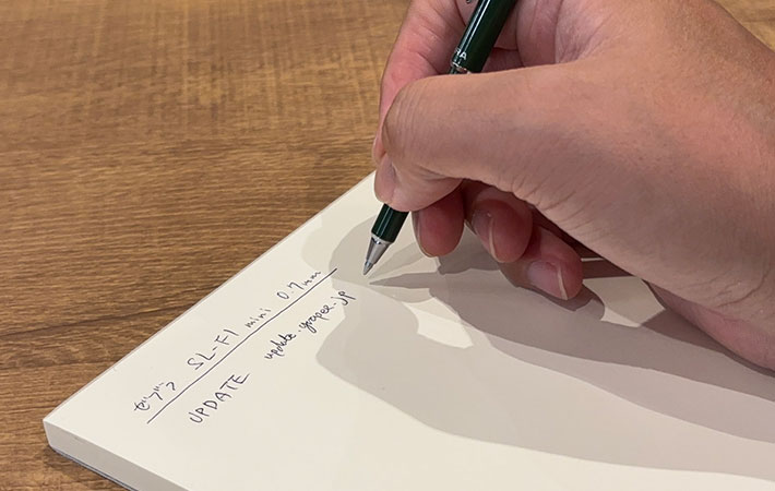 書き心地は0.7mmの油性らしく、しっかりとした線が出るタイプ。ササッと書くメモはもちろん、たくさん書き込んでも不便さはほとんどありませんでした。