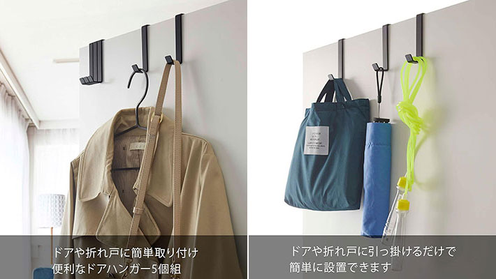 ドアやクローゼットの折れ戸などに取りつけられるハンガーで、欲しいところに引っ掛けるだけで簡単にフックができちゃいます。