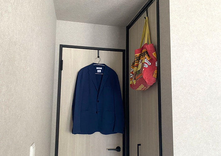 冬のリビングで作業する時は、肌寒さを感じた時に手が届く場所に取りつけてカーディガンを掛けたり、夫の出張の前日はクローゼットの扉にスーツを一式引っかけておいたり…。