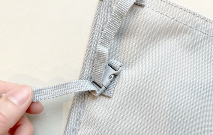 手持ちの洗濯カゴに合わせて紐の長さを整えたら、最後にバックルを留めるだけで取りつけは完了。使い方はとっても簡単です。
