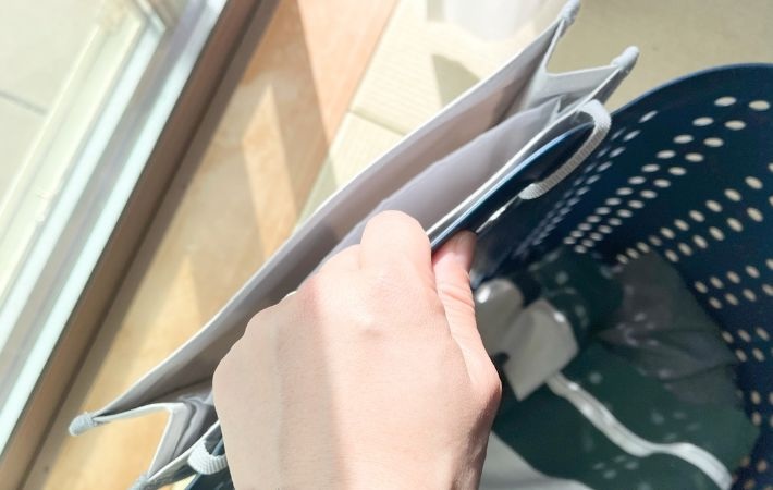筆者は洗濯カゴの持ち手部分に取りつけていますが、持ち運びの邪魔になることはなく、普段通りの動作を妨げないのも好印象です。