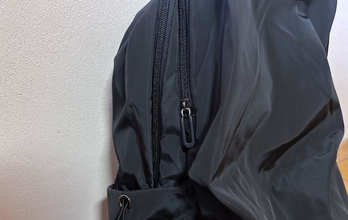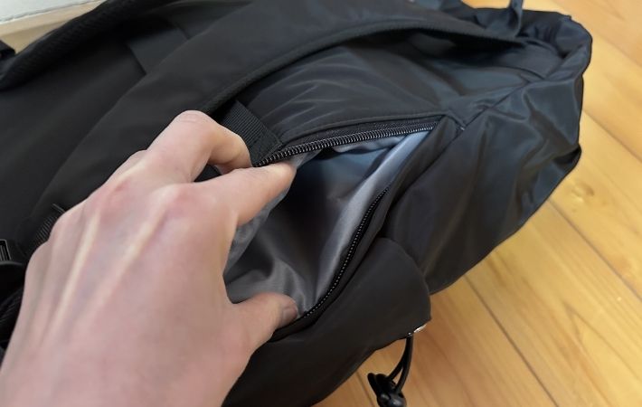 まずは首元に1か所、そして背中側にも独立したファスナーポケットが備わっています。
