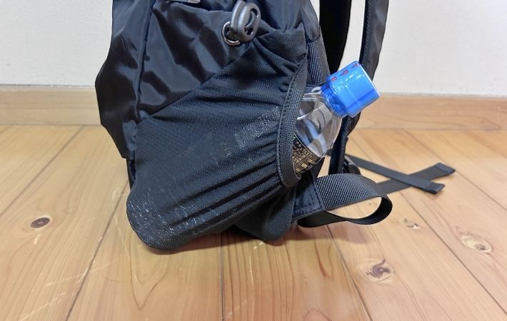 片方には口が斜めにデザインされているメッシュポケットがあり、ドリンク入れにおすすめです。