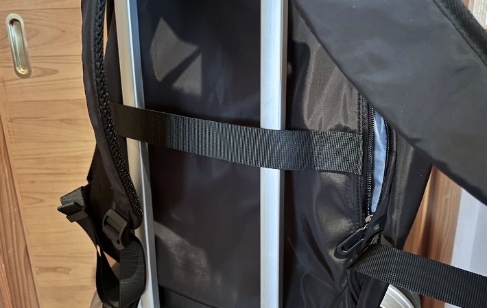 背面にはキャリーバッグのバーに通せるベルトがついており、出張時のサブバッグとしても活躍。