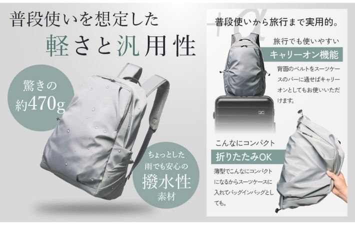 「もっと早く使えばよかった…」 通勤や自転車移動が激変する神リュックを発見 ファッション By - shio 更新:2026-04-11 ※本記事はUPDATEが独自に制作したコンテンツです。また、本記事を経由して商品の購入が発生した場合に、ECサイト等から送客手数料を受領することがあります。 日々の移動手段がほぼ自転車の筆者にとって、バッグ選びはかなり重要。 トートなどの背負えないバッグは前カゴに入れるとハンドルが取られやすく、運転に集中できないのが悩みでした。 そんな小さなストレスを解消してくれるのが、リュックサック。その中でも『KACHIKA(カチカ)』のリュック『SOLA』(以下、『KACHIKA SOLA』)がおしゃれで機能的だったのでご紹介します。 Amazonで見る 楽天市場で見る 目次 1. 万博出展ブランド『KACHIKA』の超軽量リュック『SOLA』を徹底レビュー1.1. 静けさの中に個性を忍ばせたデザイン1.2. 清潔さをキープするデオドラントルームつき1.3. 『軽い×強い×弾く』素材感1.4. 背負ったまま手が届く計算された収納設計1.5. 柔軟だから旅行や出張にも2. 実際に使ってみて感じたこと3. まとめ 万博出展ブランド『KACHIKA』の超軽量リュック『SOLA』を徹底レビュー ・サイズ(約):幅28cm×高さ46cm×マチ16cm ・重量(約):470g 静けさの中に個性を忍ばせたデザイン まず、目を引くのは余計な装飾を一切削ぎ落とした、シンプルでスタイリッシュなシルエット。 高気密で若干光沢を感じる生地が使われています。 筆者 派手なロゴや複雑なストラップがないからビジネスシーンにもよさそう! 『静けさに、個性を忍ばせて』というブランドのコンセプト通り、落ち着いた印象。誰でも大人カジュアルに背負うことができるでしょう。 筆者 ユニセックスなデザインなので、パートナーと共有したり、家族で使い回したりできる汎用性の高さも魅力です。 清潔さをキープするデオドラントルームつき 汗をかいた後の着替えや食品などを収納した時のバッグって、密閉していると「ニオイ」が気になることがありますよね。 実はこの『KACHIKA SOLA』、そんな日常の小さなお悩みを解決してくれる驚きの仕掛けが隠されているんです。 メインコンパートメントの内側に、デオドラントテープが採用されており、気になるニオイを元から分解してくれる仕組みになっています。 自転車を漕いで汗をかいた後の衣類やお弁当などの食品を入れても、においをきにしなくていいのは本当に心強いです。 筆者 おむつを入れられるからマザーズバッグとして愛用している人も多いみたい! 『軽い×強い×弾く』素材感 手に取った瞬間から実感できる軽さと丈夫さ。 高耐久テストに合格するレベルのしっかりとした生地感にもかかわらず、『KACHIKA SOLA』の重さはわずか470g程度しかありません。 そのため、荷物をたくさん入れても、肩や腰への負担を最小限に抑えられます。 また、はっ水素材が採用されているので旅行やアウトドアにも安心。完全防水ではありませんが、ちょっとした雨なら中身を濡らさず持ち運べますよ。 ちなみに従来のリュックはマグネットで開閉できるタイプだったそう。 この場合、勝手に開いてしまうことがあったため、雨水が入るというトラブルが報告されていました。 しかし、今回のモデル『KACHIKA SOLA』はファスナー仕様になったので、水濡れのリスクが減り、さらに安心して使えるようになっています。 しっかり閉じておけば、走行中の振動でバッグが開いてしまう心配もありませんよ。 背負ったまま手が届く計算された収納設計 次は収納スペースを詳しくチェックしていきましょう。 メインコンパートメントにはPCやタブレット専用のスペースがあります。 クッション性があるから電子機器などを持ち運ぶ時にも安心。13インチのノートPCが余裕で収まるサイズ感でした。 A4ファイルもご覧の通り、余裕を持って入れられます。 内側にはファスナーつきのポケットが1か所ついていました。 メインコンパートメントとは別にフロントにも大きな収納スペースがついていて、しっかり奥行きがあります。 また、小物の収納に活躍する隠しポケットが非常に便利です。 まずは首元に1か所、そして背中側にも独立したファスナーポケットが備わっています。 さらに注目したいのが、両サイドについているコードで調整するタイプのオープンポケットです。 片方には口が斜めにデザインされているメッシュポケットがあり、ドリンク入れにおすすめです。 背負ったままの姿勢でも無理なく手が届き、取り出しやすいように設計されています。 柔軟だから旅行や出張にも 背面にはキャリーバッグのバーに通せるベルトがついており、出張時のサブバッグとしても活躍。 さらに、使わない時は薄く折りたたんでコンパクトに収納できるため、持ち運びにも重宝します。 旅先で急に荷物が増えた時のサブバッグとして、これほど心強いアイテムはないでしょう。 実際に使ってみて感じたこと ロゴなどの余計な装飾を一切排除したシンプルなリュッ